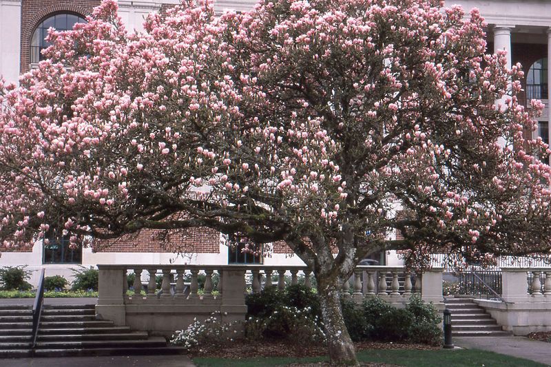 Magnolias are celebrated for their large, showy blooms that appear in early spring. These trees are a favorite among garden enthusiasts for their striking contrast of white and pink flowers.