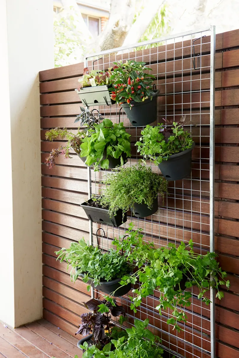 Combine privacy and greenery with a vertical herb garden. Use pocket planters or repurposed wooden crates to grow herbs like mint and lavender.