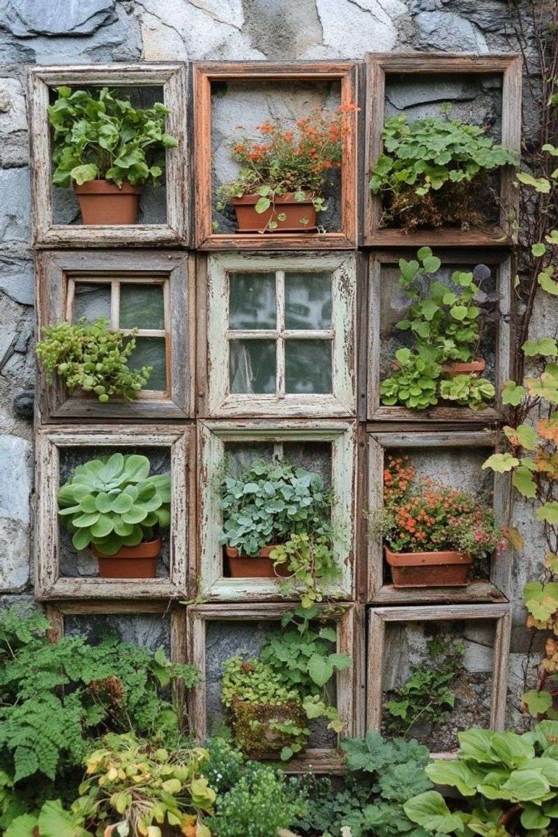Add whimsical charm to your garden with repurposed window frames. Lean these vintage windows against a fence or tree to create an illusion of an outdoor room.