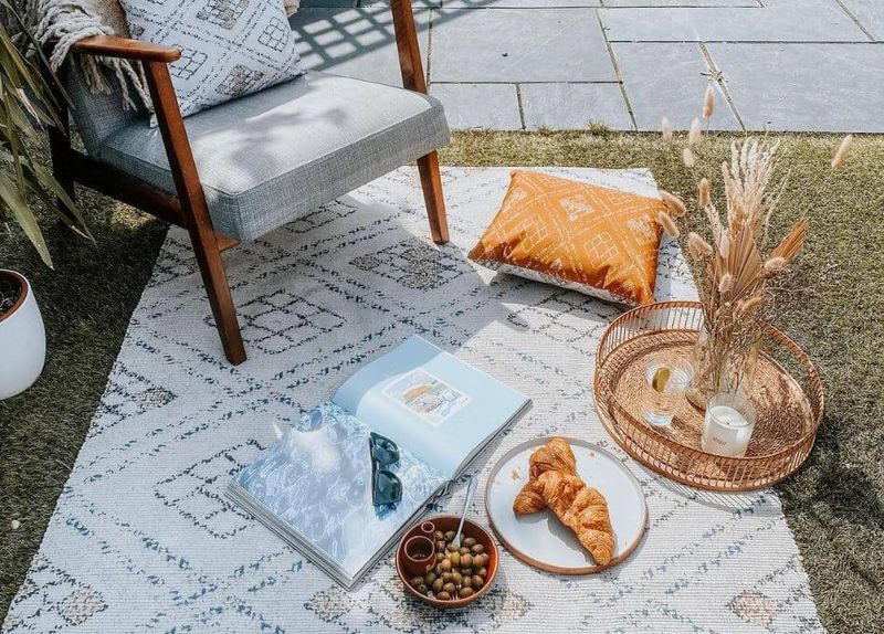 Transform a patch of grass into a lounge zone with a waterproof outdoor rug. Add colorful floor pillows for comfort, and you’ve got a welcoming space for relaxation.