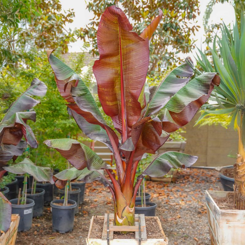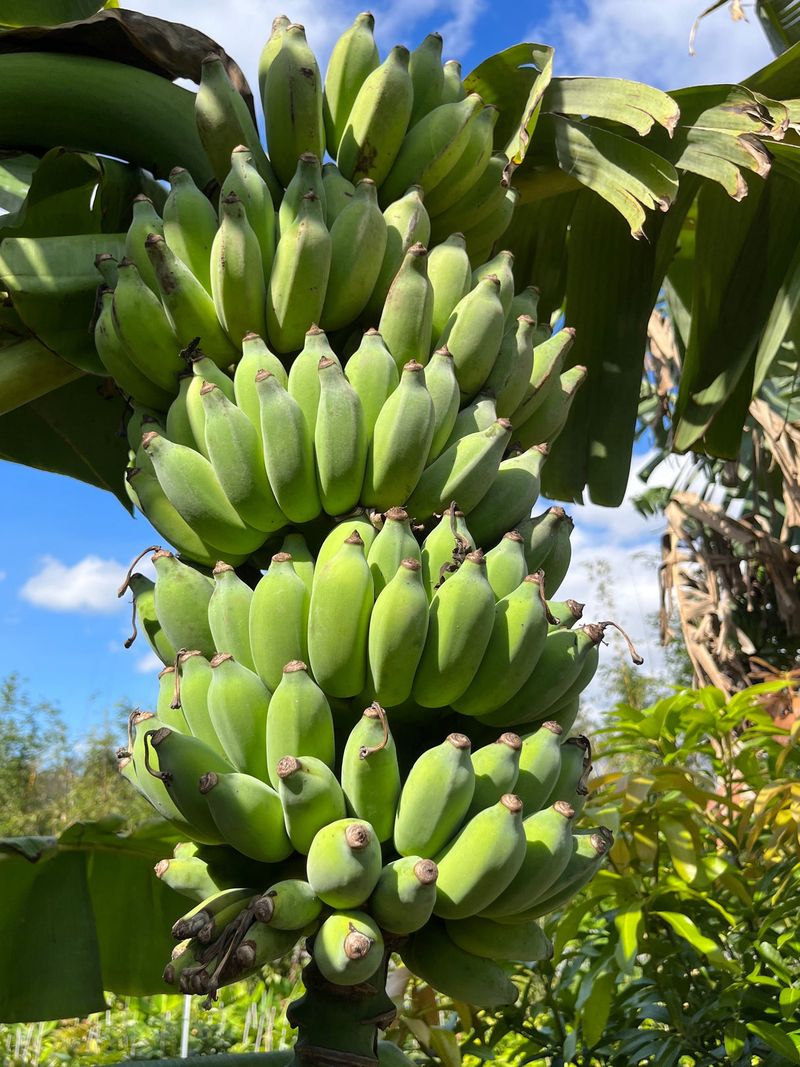 The plant’s broad leaves provide ample shade, creating a cool retreat in the garden. Its sweet, small bananas are perfect for fresh eating or cooking.
