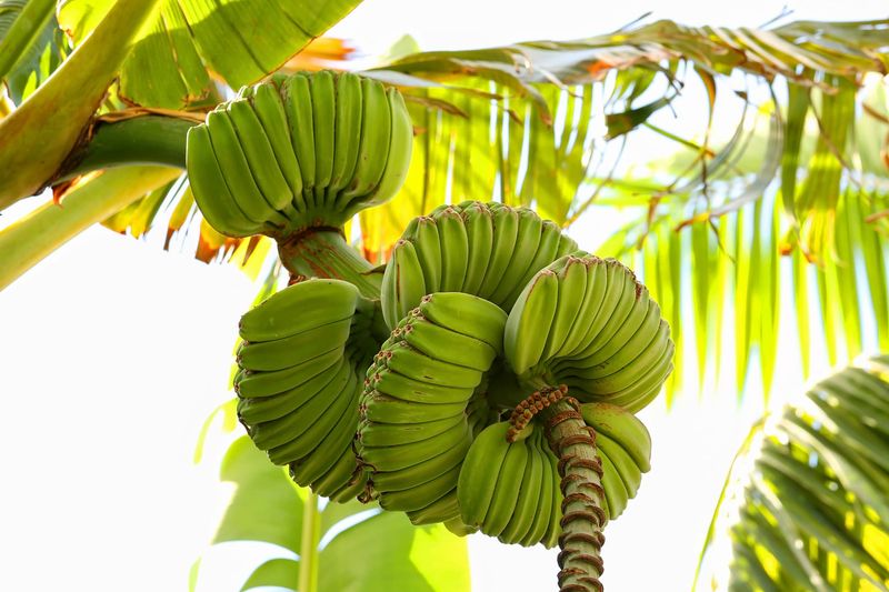 Praying Hands bananas stand out with their unusual appearance, where bananas grow in clusters fused together. This intriguing shape is a conversation piece in any garden.