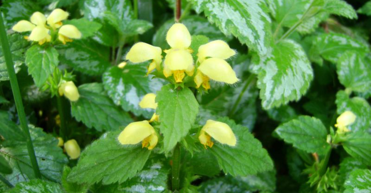 Yellow Archangel’s golden hue belies its invasive tendencies. Spreading quickly, it can carpet woodland floors.