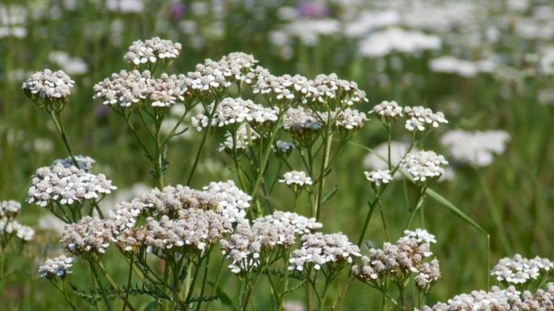 Yarrow’s feathery foliage and flat clusters of white flowers are not only visually appealing but also ecologically vital. These plants attract predatory insects, aiding in natural pest control.