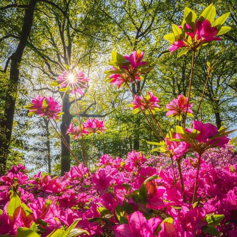 Azaleas are a spectacle of vibrant color. Their blooms cover the bushes so densely that they create a breathtaking visual impact.