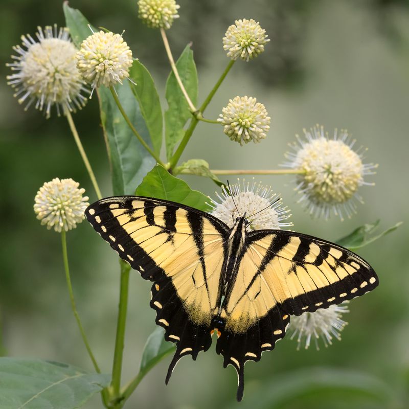 Buttonbush is a unique shrub, known for its spherical clusters of white flowers. These blooms are irresistible to butterflies, providing both nectar and visual interest.