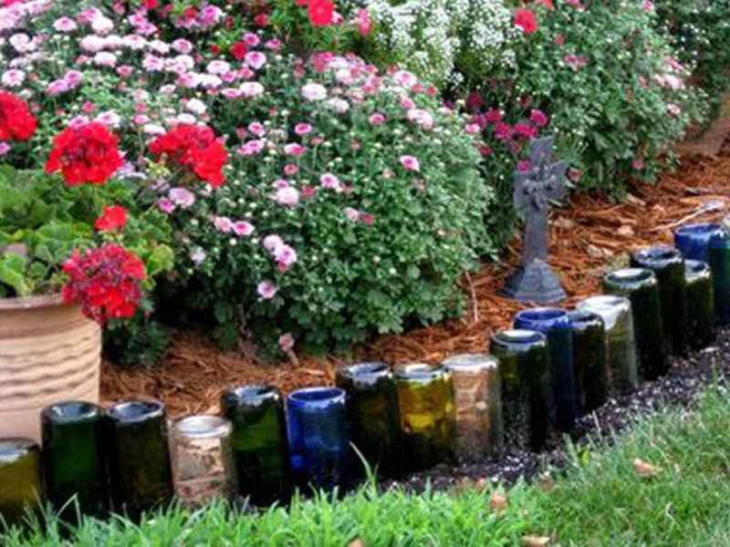 Repurpose empty wine bottles to create unique garden borders. Bury them upside down along the edges of your garden beds. This project not only recycles glass but also adds an artistic touch to your garden design. The varying colors of the bottles can complement the natural hues of your plants, creating a visually striking contrast. These borders can define spaces within your garden while being an eco-friendly alternative to traditional materials.