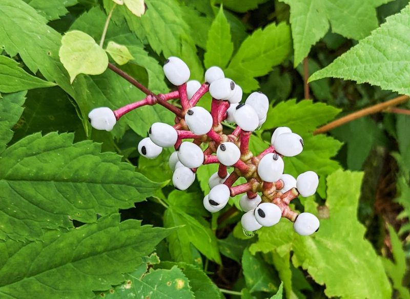 White Baneberry, also known as Doll’s Eyes, intrigues with its stark white berries and contrasting red stems. These features make it a striking yet eerie presence in wooded areas.