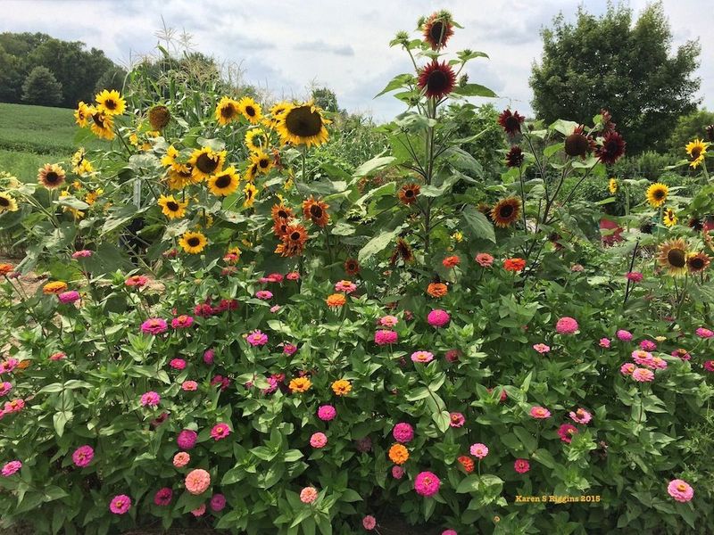 Sunflowers attract pollinators, while zinnias fill in the gaps below, offering a riot of color. This partnership enhances the garden’s aesthetic and ecological balance.