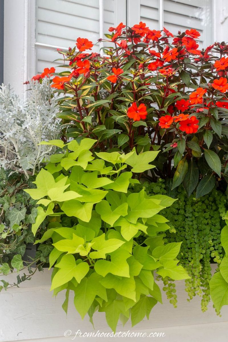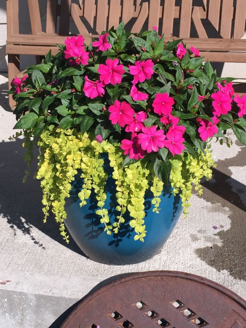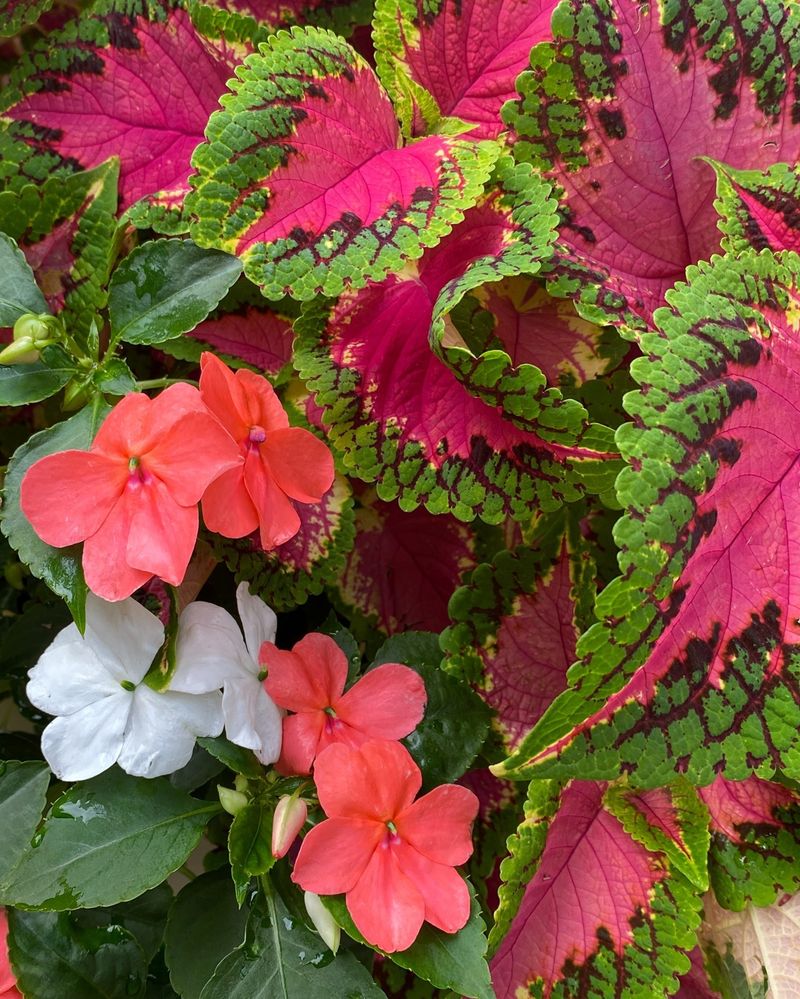 Incorporating lush greenery into the garden brings vitality and freshness. Impatiens and sweet potato vine are a lush combination that delivers both color and texture. The vine’s trailing habit adds a cascading effect, perfect for containers or hanging baskets. Its green leaves provide a verdant backdrop to the impatiens’ bright blooms. This combination thrives in partial shade, offering a vibrant and lush look that is easy to maintain. Together, they create a garden space that is both lively and serene, bringing a touch of the tropics to any outdoor setting.