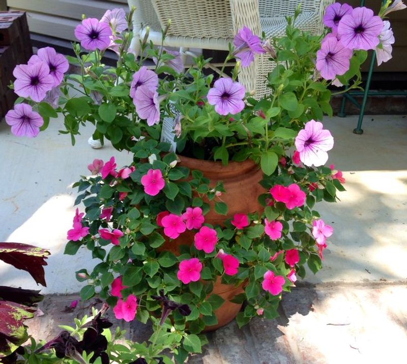 For a garden that overflows with color, impatiens and petunias are the perfect match. Petunias, with their cascading blooms, add a touch of elegance to the impatiens’ vibrant display. This pairing thrives in sunny locations, where their colors can merge into a harmonious blend. Together, they create a lush garden atmosphere that is both eye-catching and inviting. Ideal for containers or hanging baskets, they bring a sense of abundance to any space. Their vibrant colors and easy growth make them a perennial favorite among garden enthusiasts.