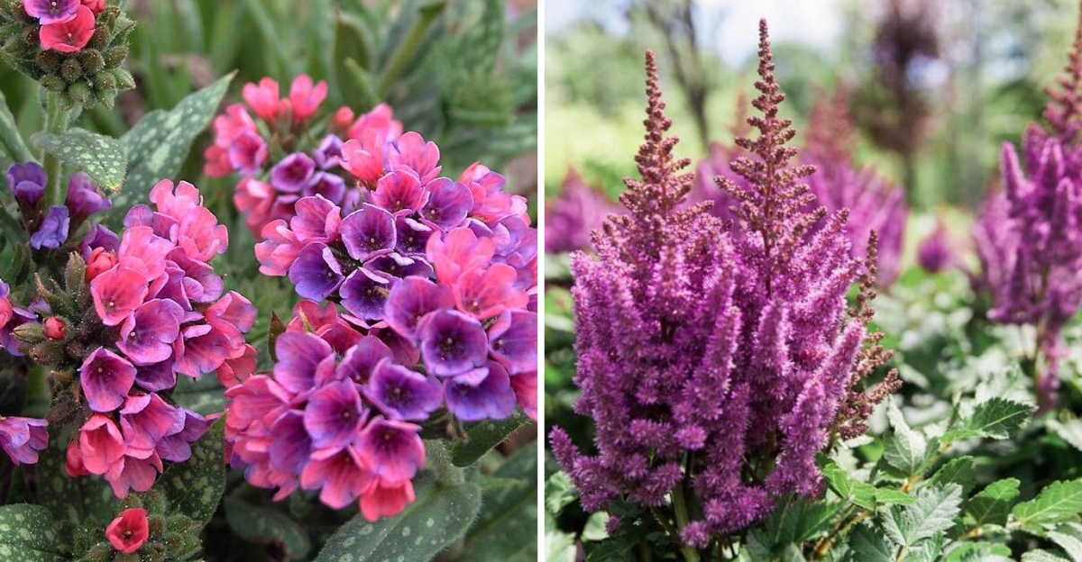 Their vibrant purple flowers bloom in late spring and continue through summer, attracting pollinators. Astilbe’s fern-like foliage complements its blooms, providing a lush, green backdrop.