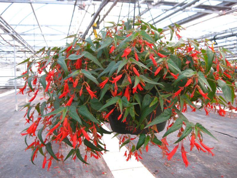 With its vivid orange-red blossoms, the Begonia ‘Bonfire’ brings a fiery touch to any hanging basket. This begonia thrives when kissed by filtered sunlight, creating a stunning waterfall of color. Its lush blooms contrast beautifully against its deep green foliage, providing a striking visual treat.