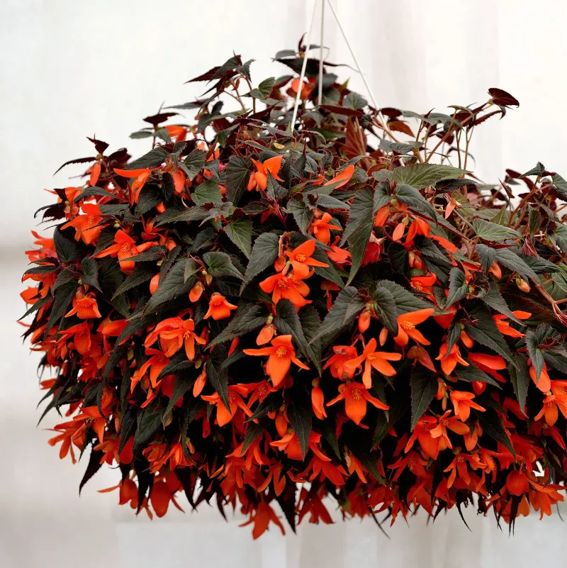 The ‘Summerwings Ebony & Orange’ begonia combines vibrant orange blooms with dark, rich foliage for a striking contrast. This begonia is perfect for adding drama and depth to any garden setting.