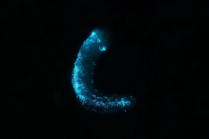 Triggered by movement, these organisms emit a bright blue light, turning the waves into a canvas of illumination. Each ripple becomes a stroke of brilliant light.