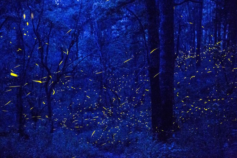 The ethereal blue ghost fireflies create an unforgettable scene in the wooded areas of the southeastern United States. Unlike their flashing counterparts, these fireflies emit a steady, soft blue light.