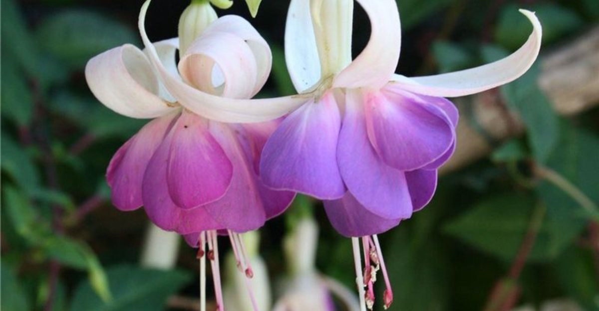 15. Fuchsia (Fuchsia × hybrida) – Dangling, two-tone blooms begin almost immediately after planting into hanging baskets