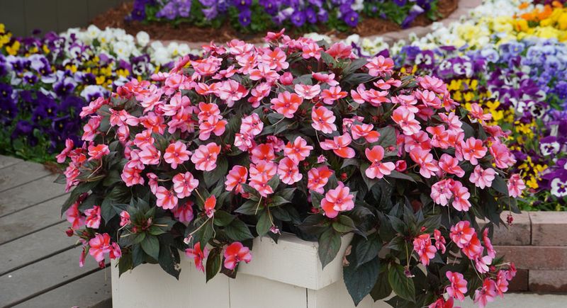 16. Impatiens (Impatiens walleriana) – Low-light specialists that flower instantly from nursery pots and then persist all season