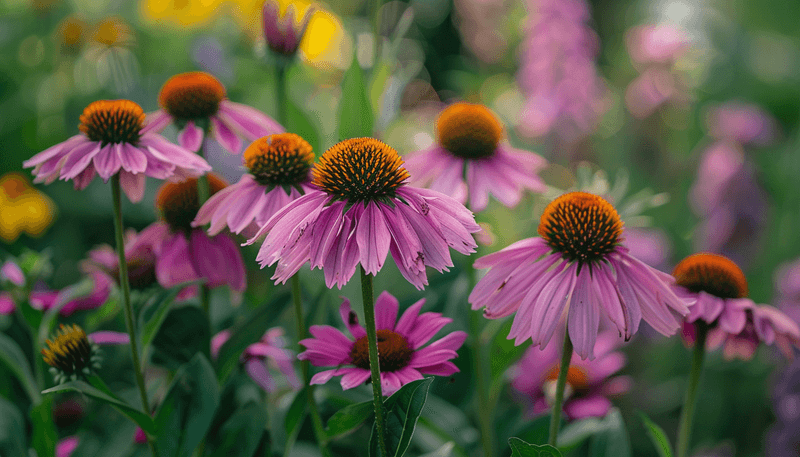 Purple Coneflowers, a variety of Echinacea, are known for their vibrant hues and sturdy nature. Thriving in sunny locations, they are resilient to drought and poor soil conditions.