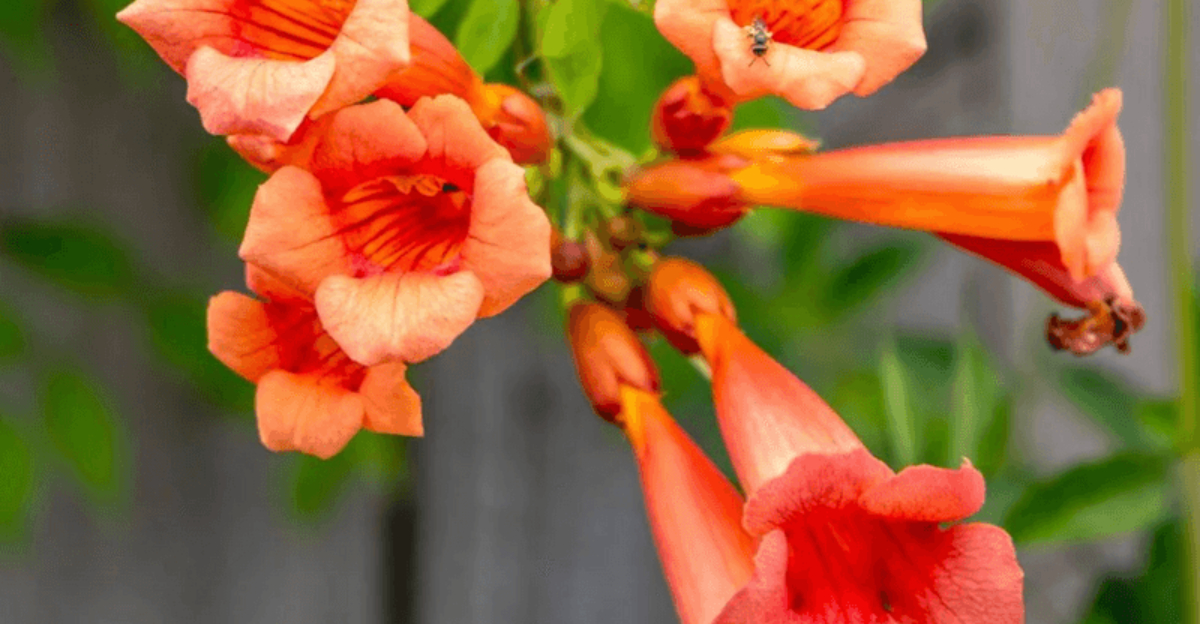 Trumpet vine, with its fiery orange-red blooms, creates a dramatic statement in any garden. Envision a rustic garden wall adorned with these trumpet-shaped flowers, buzzing with pollinators.