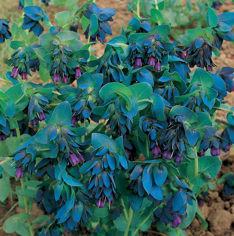 Cerinthe major, or Honeywort, captivates with its lush blue-green foliage and distinctive purple-blue flowers. Native to the Mediterranean, it thrives in sunny, well-drained sites.
