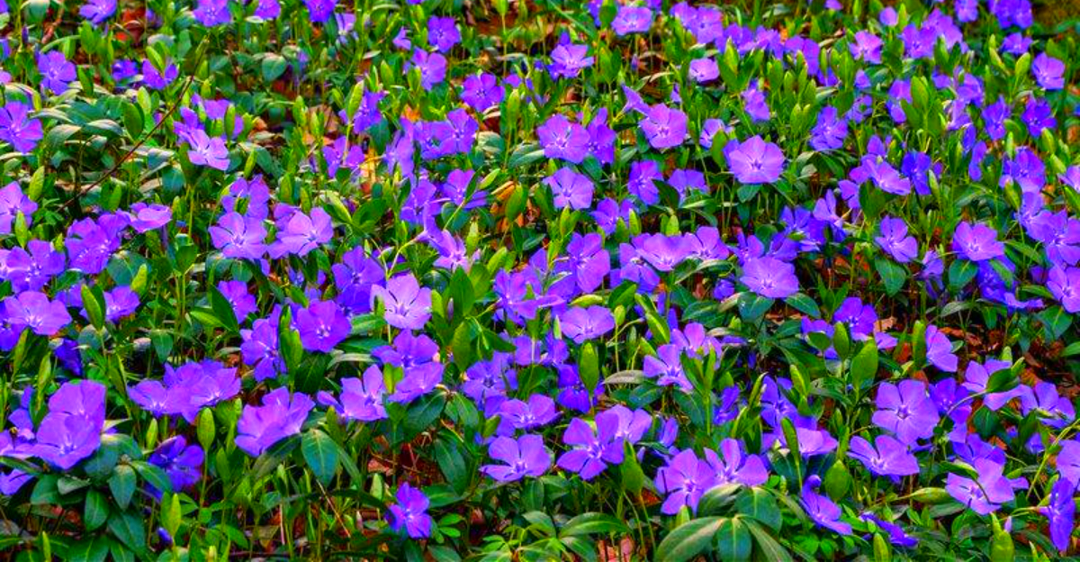 Periwinkle forms dense mats of glossy evergreen leaves topped with perky five-petaled flowers in blue, purple, or white throughout the growing season. This vigorous ground cover handles deep shade and dry conditions equally well.