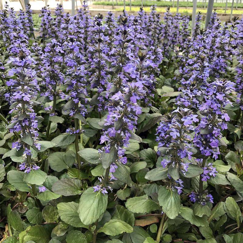 Ajuga reptans ‘Catlin’s Giant’ offers robust blue flower spikes that rise above its dense, glossy foliage. This groundcover is perfect for adding color to shaded areas.