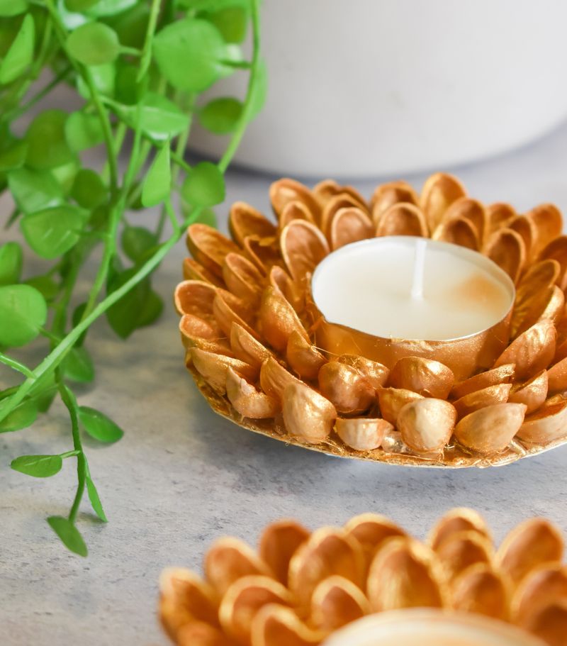 Transform pistachio shells into charming candle holders for a cozy home ambiance. Arrange them in a circle around a small tea light or votive candle.