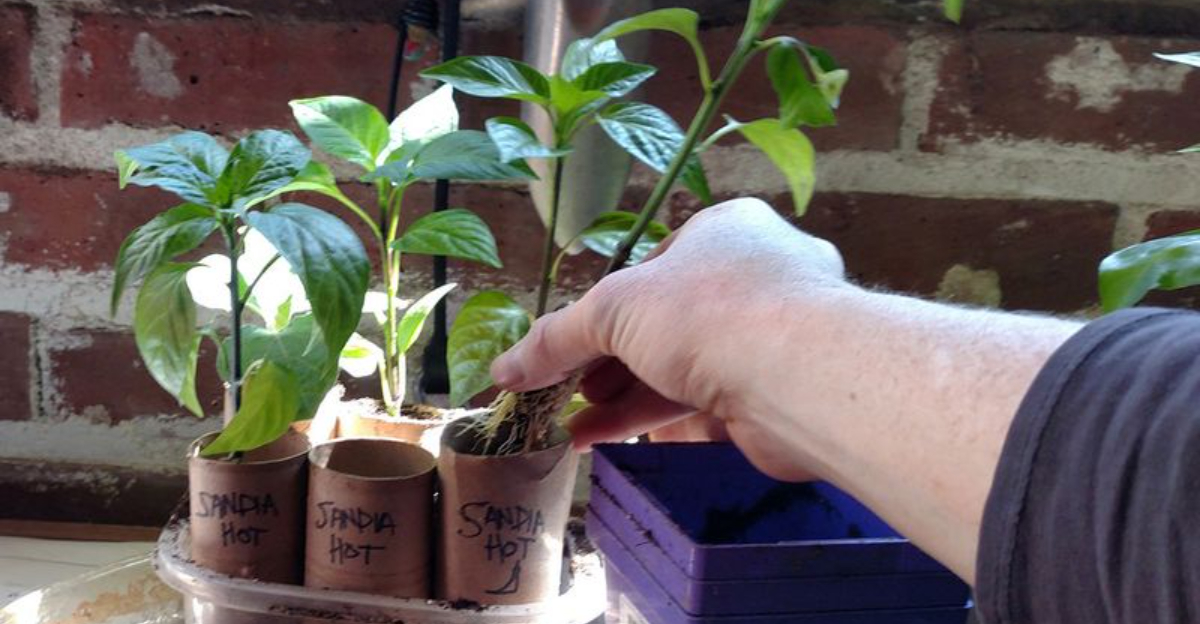 Support young tomato and pepper plants by slipping toilet paper tube rings around their stems. These rings provide stability and prevent bending as the plants mature.