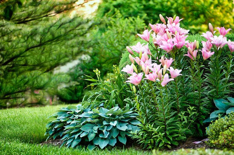 Hostas, known for their broad and textured leaves, offer a striking contrast to the elegant blooms of lilies. They thrive in shaded areas and enhance the visual appeal of a lily garden. Hostas’ lush foliage provides a cool, moist environment that lilies appreciate. Their ability to suppress weeds also benefits lilies, reducing competition for nutrients and water. Hostas are low-maintenance and add a verdant, leafy backdrop that emphasizes the beauty of lilies. These plants together create a harmonious and visually appealing garden space.