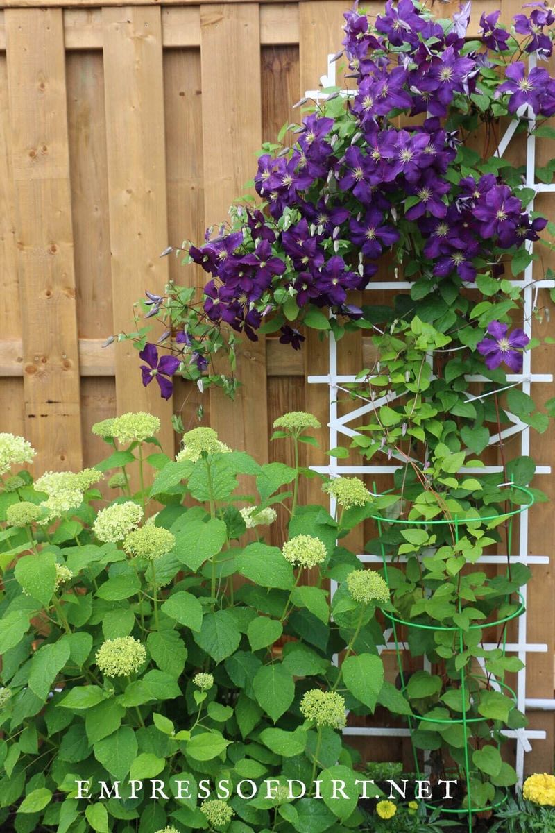 Clematis vines have a distinctive planting requirement: they prefer their “head in the sun, feet in the shade.” Locate a spot where the vine can bask in sunlight while its roots remain cool and shaded.