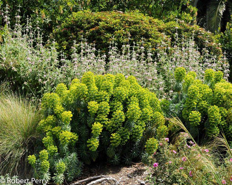 Euphorbia characias, or Mediterranean Spurge, stands out with its architectural form and milky sap. Picture a rocky hillside adorned with its dramatic foliage, thriving in the sun’s embrace. Excellent drainage is a must for this shrub-like perennial, making it perfect for lean soils. Its striking presence adds structure and interest to gardens, while its resilience ensures longevity. Beyond its aesthetic appeal, Euphorbia characias is valued for its ability to deter grazing animals, making it a practical choice for rural landscapes.