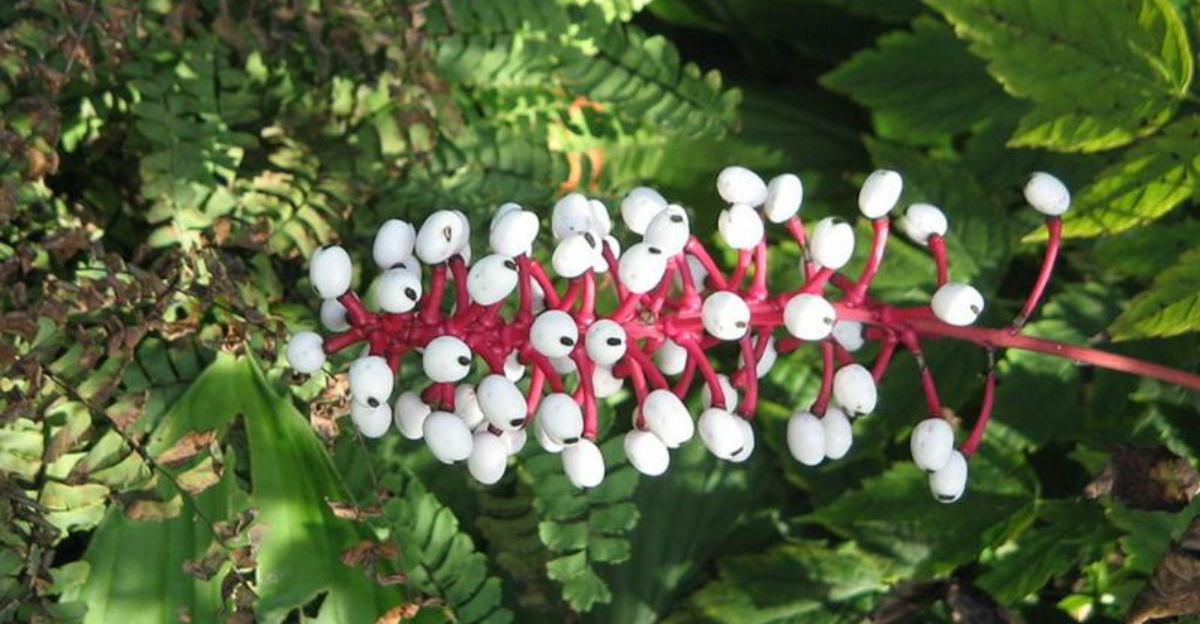 Its striking white berries with black dots resemble the eyes of porcelain dolls, lending it an unsettling beauty that masks its perilous qualities.