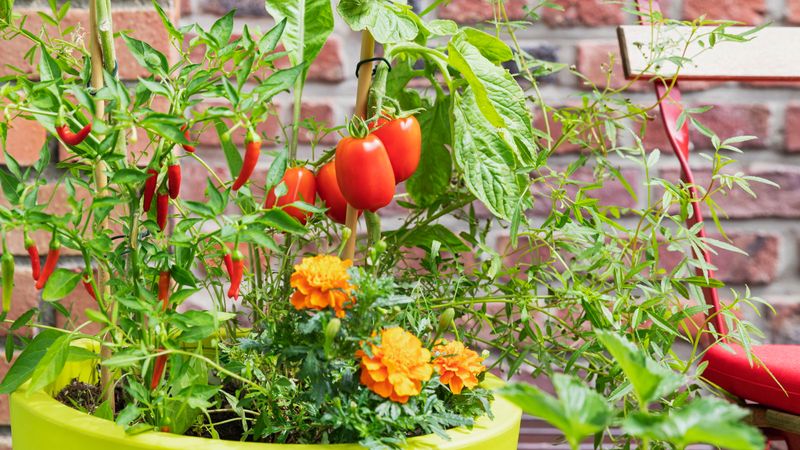 Peppers and marigolds make a striking and protective partnership. Marigolds are known for their ability to deter nematodes and other pests, creating a safe space for pepper plants to flourish.