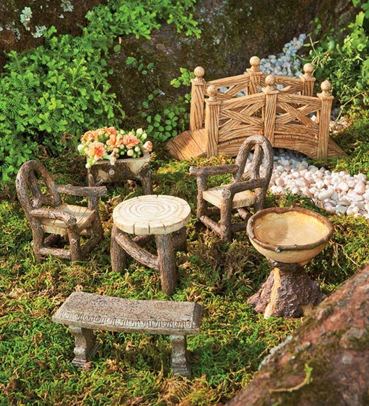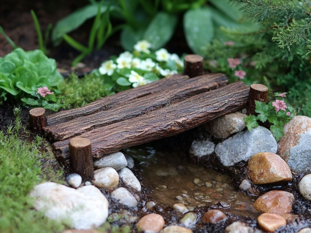 Design a fallen log bridge to cross a tiny stream or pathway. This rustic feature adds depth and a touch of woodland adventure to your fairy garden.