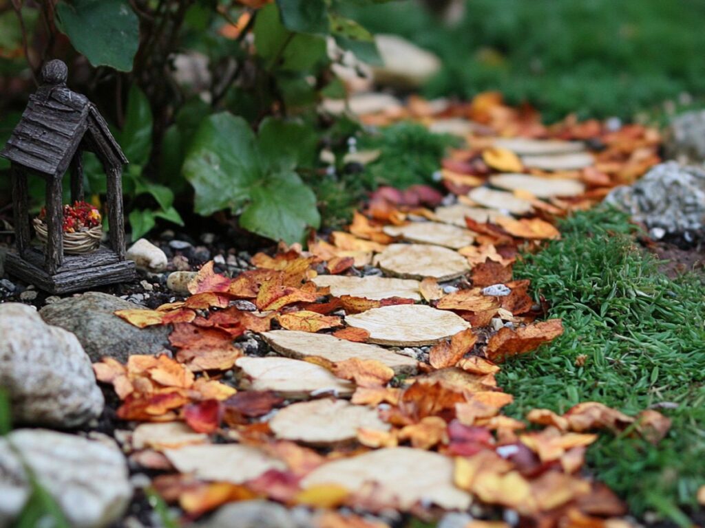 Create a pathway using tiny dried leaves, guiding visitors through your fairy garden with a warm, autumnal touch. These leaves capture the essence of fall, inviting you to wander along this cozy route.