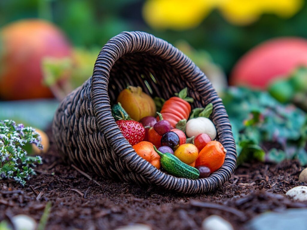Craft a tiny cornucopia filled with mini fruits and vegetables. This traditional symbol of abundance reflects the spirit of Thanksgiving, adding a festive touch to your garden.