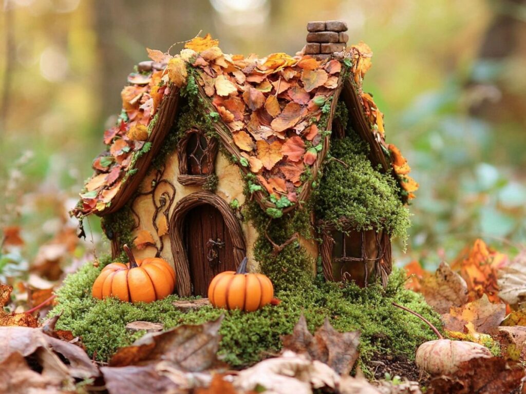 Construct a cozy fairy cottage to serve as the centerpiece of your garden. Decorate it with seasonal elements like small pumpkins and leaf garlands to enhance its autumn charm.