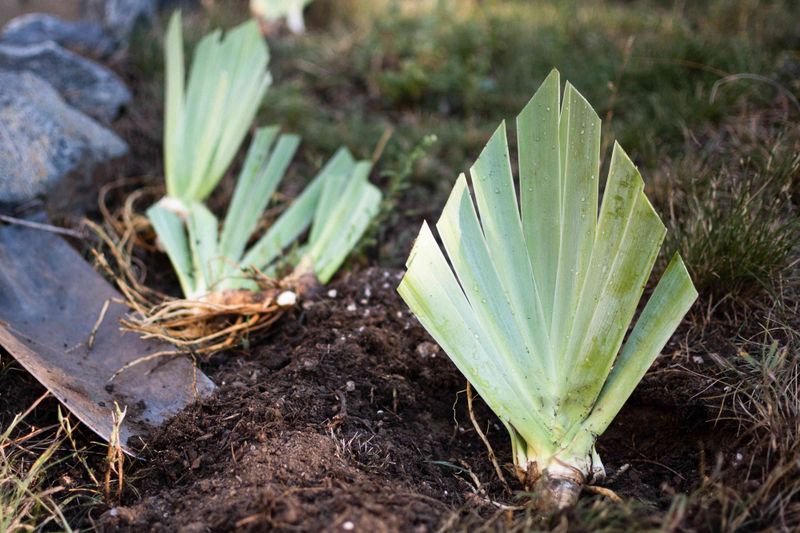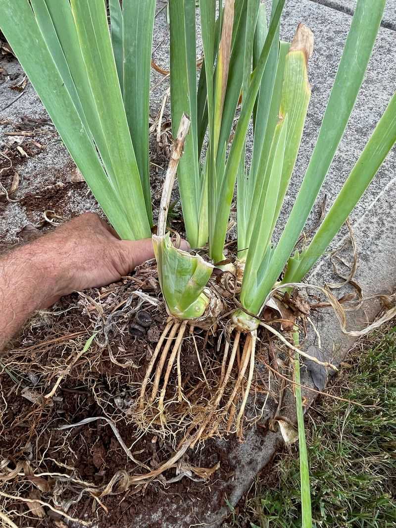 The reduced leaf surface helps the plant focus energy on root development rather than supporting excess foliage. Those trimmed fans will mark where your new divisions should face when replanting.