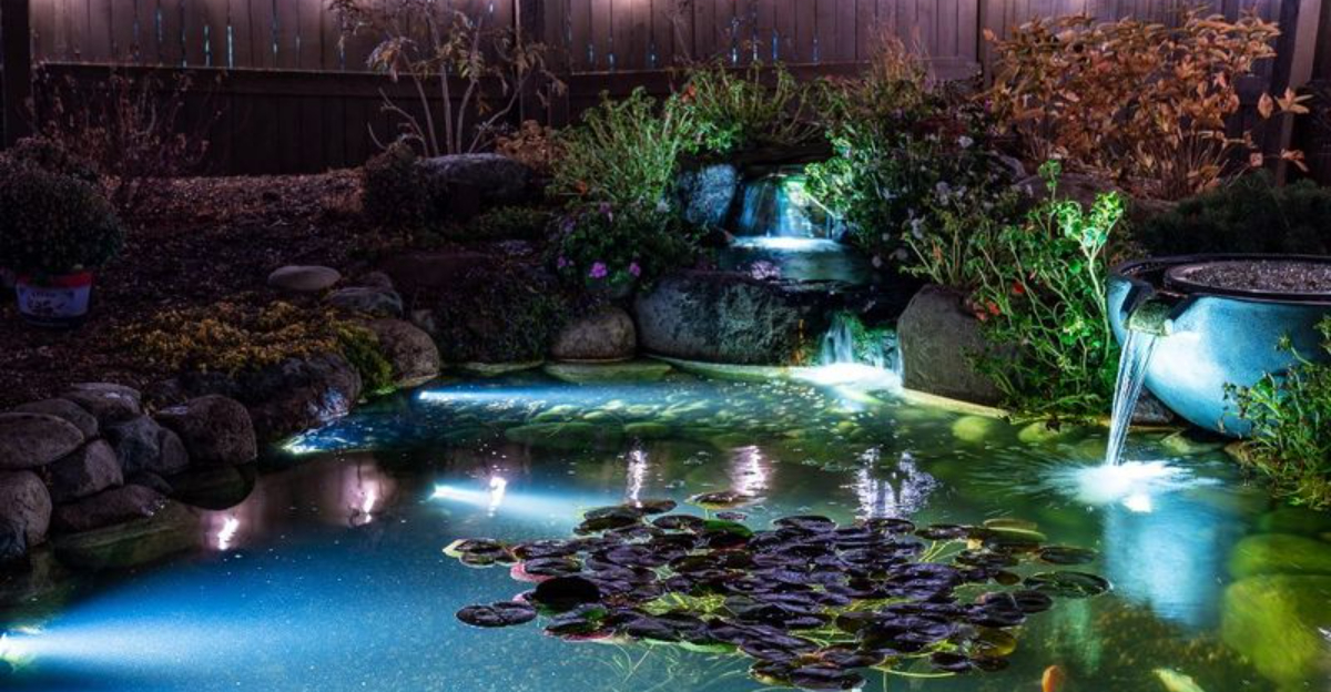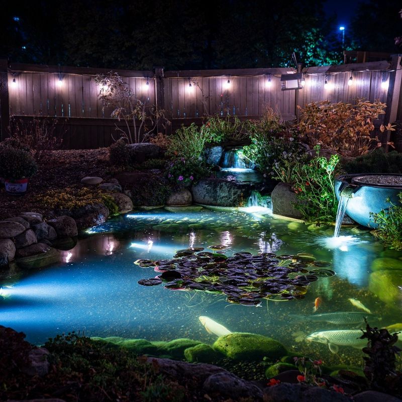 Underwater lights bring out the beauty of water lilies and koi fish, adding depth and motion to your garden.