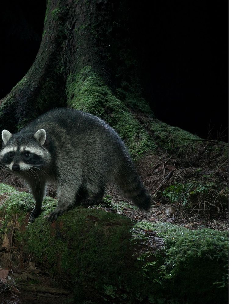 Raccoons are fascinating nighttime observers, exploring the world under the cover of darkness. Picture a raccoon navigating a moonlit forest, its eyes gleaming with curiosity.