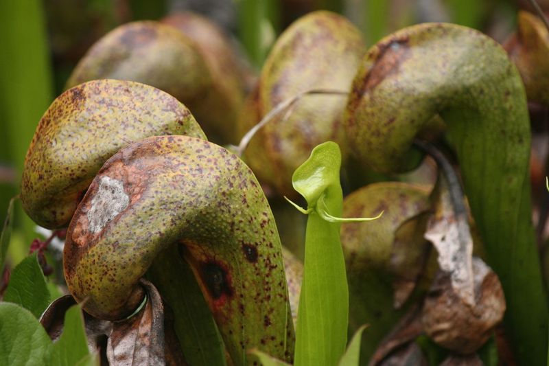 Cobra lilies mesmerize with their snake-like appearance and intriguing trapping mechanism. The plant’s tubular leaves form a chamber that lures insects with nectar and a maze-like structure that confounds their escape.