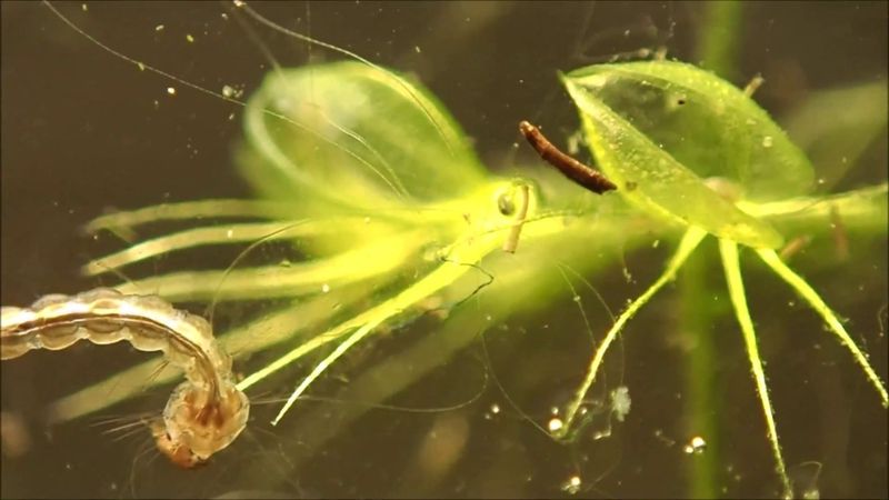 Resembling an underwater Venus Flytrap, the waterwheel plant captures prey with its circular traps. Floating in calm waters, it snaps shut on small aquatic animals with surprising speed.