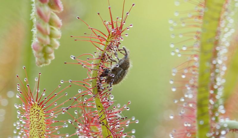 The sundew’s beauty belies its deadly nature. Covered with sticky tentacles, this plant ensnares insects with its glistening dew-like secretions. As the prey struggles, the tentacles coil around it, ensuring there’s no escape.