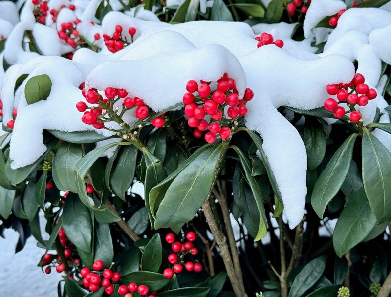Holly, adorned with glossy leaves and vibrant red berries, adds a festive touch. Together, they form a stunning contrast against the winter snow.