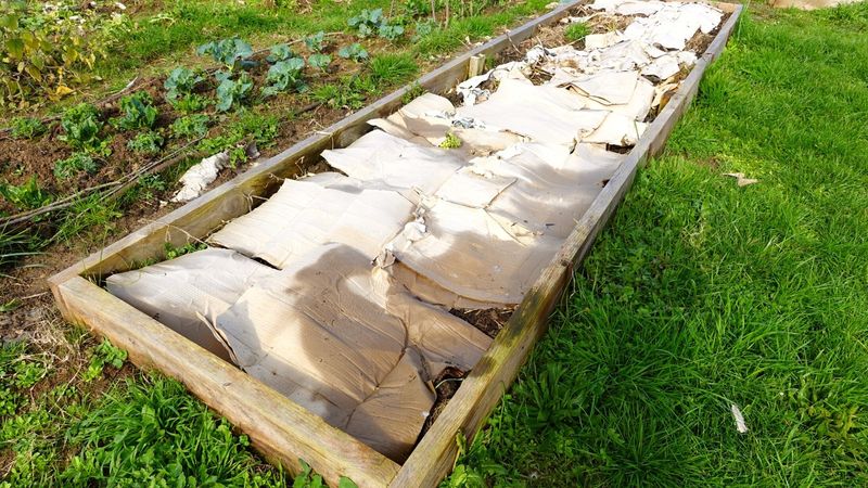 Add a layer of compostable materials on top of the cardboard—straw, leaves, or grass clippings work wonderfully. The cardboard prevents weeds from growing up into your bed while gradually decomposing to feed your soil food web.