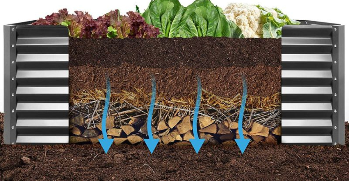 Best of all, you’ll need significantly less purchased soil to fill the remaining space—just enough to cover the top 8-10 inches where most plant roots grow.
