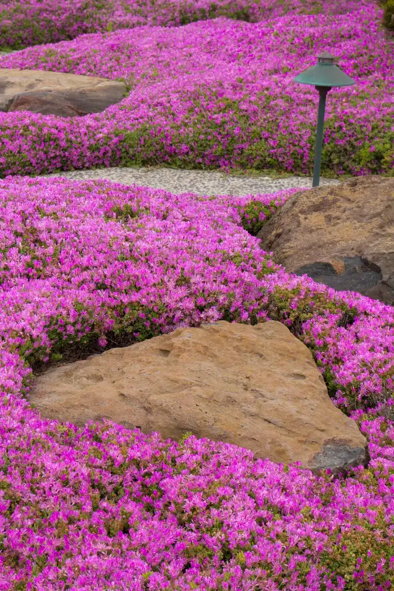 The Ice Plant dazzles with its bright pink flowers and succulent, fleshy leaves that shimmer under the sun. Perfect for dry garden slopes, it thrives in well-drained soil, offering both beauty and resilience. This ground cover spreads rapidly, forming a dense mat that holds weeds at bay. Its drought tolerance and low maintenance needs make it an ideal choice for xeriscaping. The Ice Plant’s vivid blooms add a splash of color, transforming barren areas into vibrant landscapes. It’s a true testament to nature’s brilliance and adaptability.