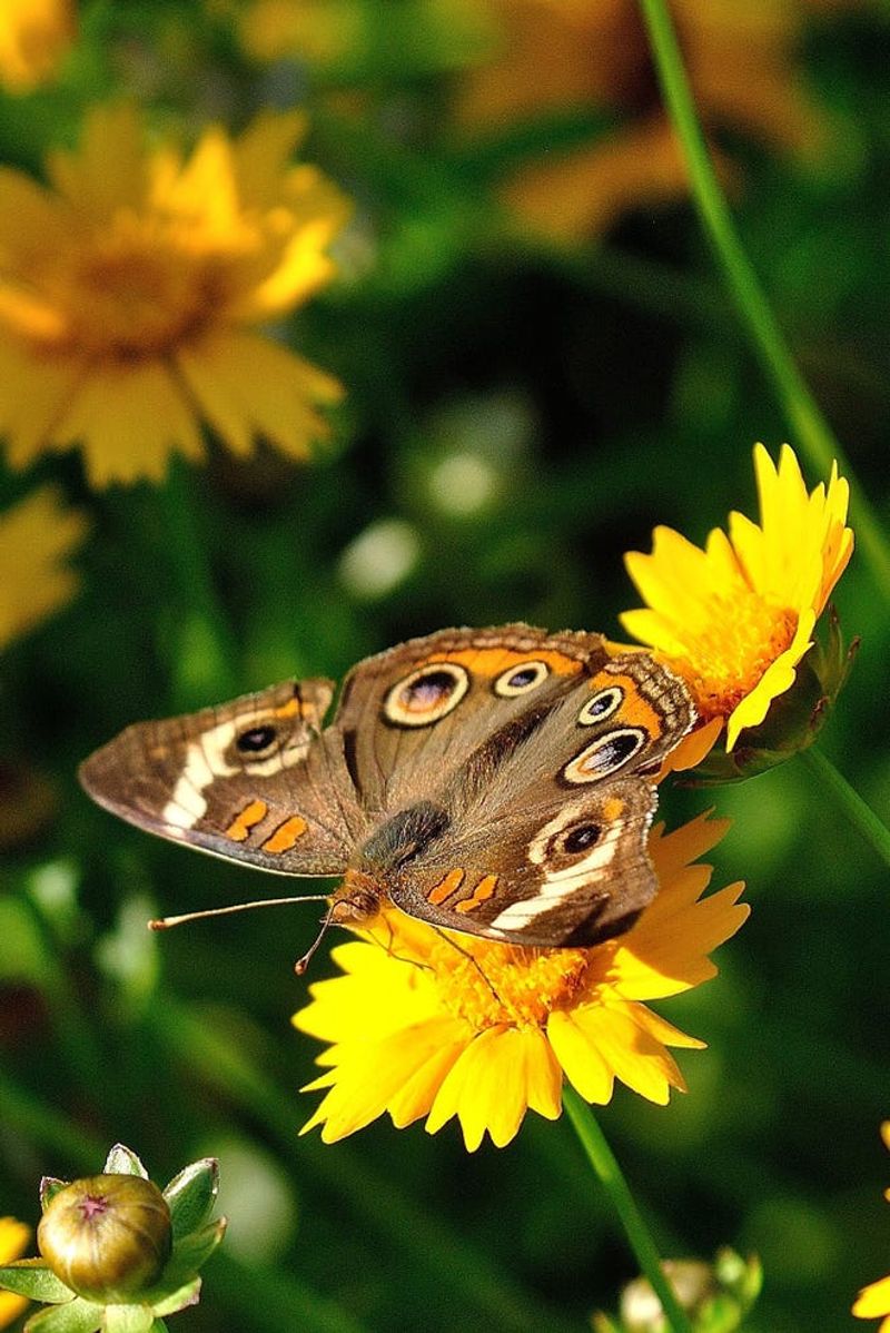 Coreopsis, with its sunshiny yellow blooms, invites butterflies and bees into the garden. It’s easy to grow, drought-tolerant, and adds a cheerful, sunny element to garden designs.