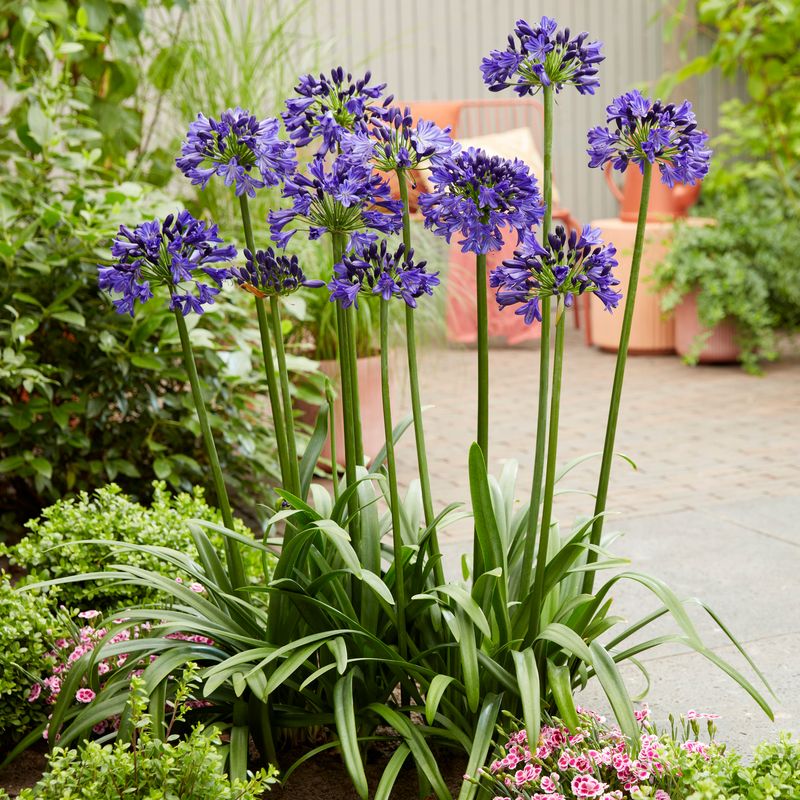 Agapanthus, or Lily of the Nile, stands tall and proud even in high temperatures. Its blue spherical flower clusters provide a striking contrast against its lush green leaves.